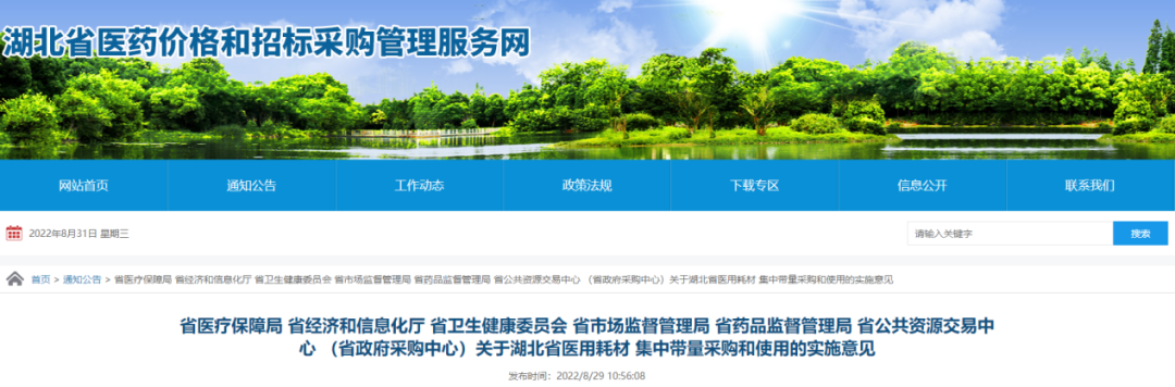 2022年8月29日,湖北省医药价格和招标采购管理服务网发布《省医疗保障局 省经济和信息化厅 省卫生健康委员会 省市场监督管理局 省药品监督管理局 省公共资源交易中心 (省政府采购中心)关于湖北省医用耗材集中带量采购和使用的实施意见》(以下简称《意见》),《意见》对采购确?;乜?/span>方面明确了具体措施。