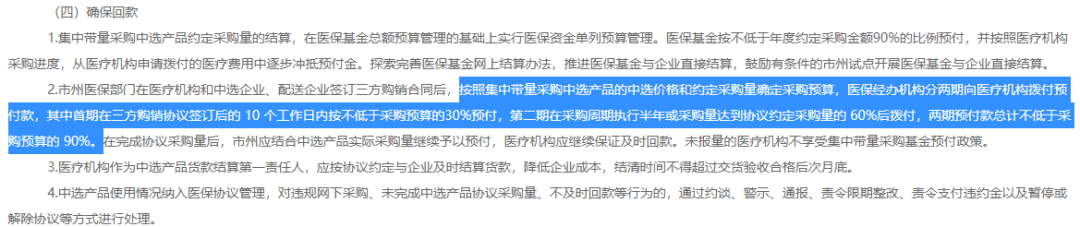 在完成协议采购量后,市州应结合中选产品实际采购量继续予以预付,医疗机构应继续保证及时回款。未报量的医疗机构不享受集中带量采购基金预付政策。
