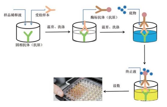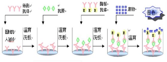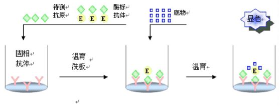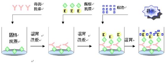 方法:用已知抗体包被,加入待测血清,再加酶标抗体,加底物显色。