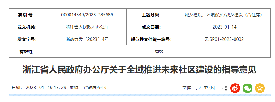 1月19日,浙江省人民政府办公厅发布《关于全域推进未来社区建设的指导意见》,意见第五条指出:要推动未来社区公共服务集成落地。进一步强化部门协同,加快产权梳理整合,加强建设运营的统筹,完善教育、医疗、养老、托育、体育健身、文化服务、交通物流、商业服务、物业服务、智慧安防、社区基层治理等各类配套设施配置??钩钦蛏缜卜裆枋┑鞑槠拦?,实施城镇社区公共服务补短板行动,建立城镇社区设施服务评价指数,形成“调查评估—迭代升级—滚动推进”的工作机制。加大公共服务供给力度,突出对“一老一小”群体的服务,加快完善以党群服务中心为主阵地,集智慧健康站、托育服务设施、养老服务设施、老年食堂、妇儿服务驿站等设施于一体的未来社区公共服务矩阵,努力实现按需配置、全面落地。(内容来源:1月19日,浙江省人民政府办公厅发布《关于全域推进未来社区建设的指导意见》)