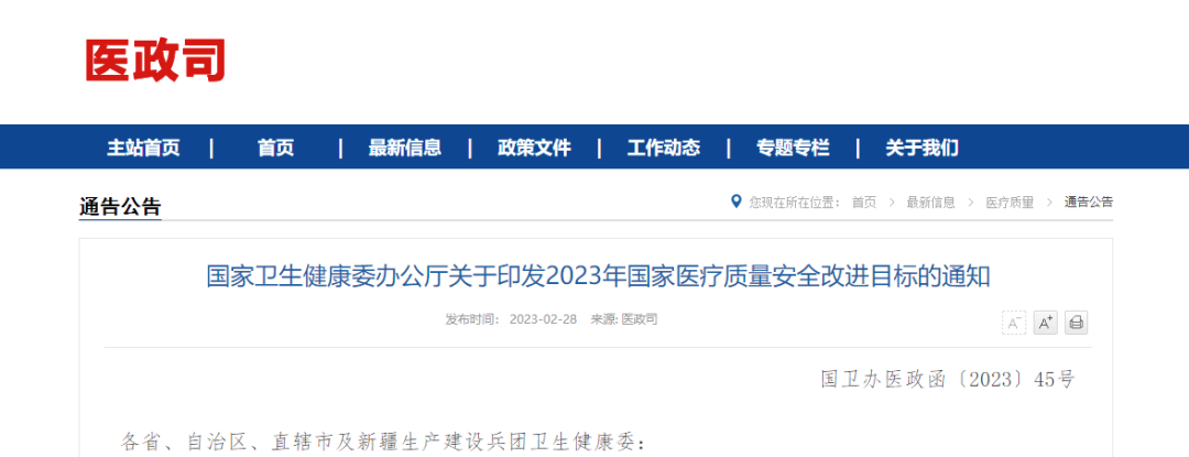 日前,医政司发布了《国家卫生健康委办公厅关于印发2023年国家医疗质量安全改进目标的通知》(以下简称《通知》)。