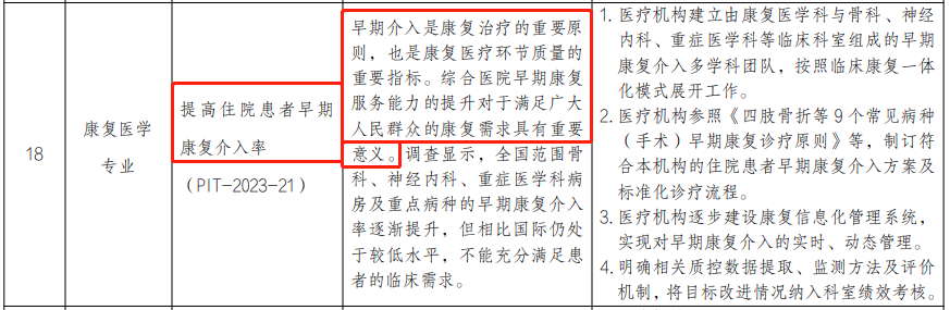 在《通知》中涉及了各专业2023年质控工作改进目标,在康复医学专业的改进目标为“提高住院患者早期康复介入率”其中早期介入是康复治疗的重要原则,也是康复医疗环节质量的重要指标。综合医院早期康复服务能力的提升对于满足广大人民群众的康复需求具有重要意义。