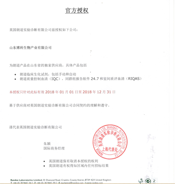 2017年度,博科生物与RANDOX 朗道的合作,取得了非常好的成绩。2017年是朗道在中国区改革的第一年,在此过程中凭借朗道优质的产品质量和博科生物优秀的业务及售后团队,博科生物紧跟国内形势,顺利完成2017年年度销售额任务。基于双方良好的合作基础和销售成绩,英国RANDOX公司将在2018年度延续与博科生物的合作关系。