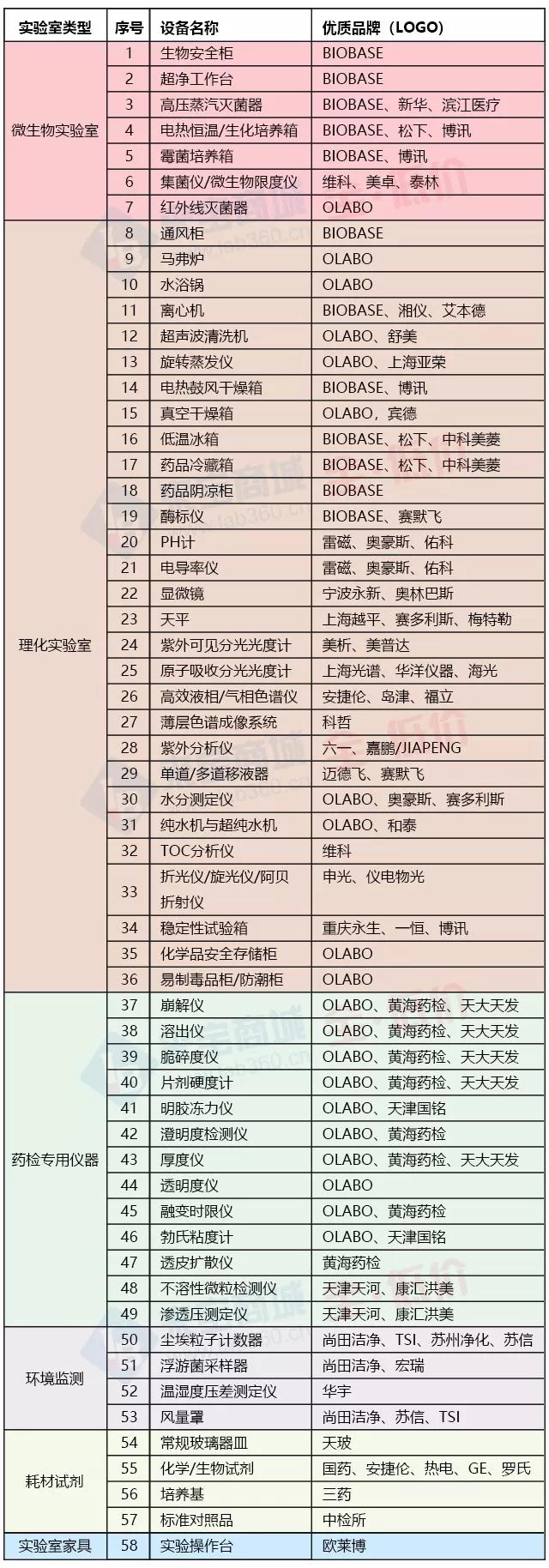 实验室类型主要包括:微生物实验室、理化实验室、药检专用仪器、环境监测、药材试剂、实验室家具等