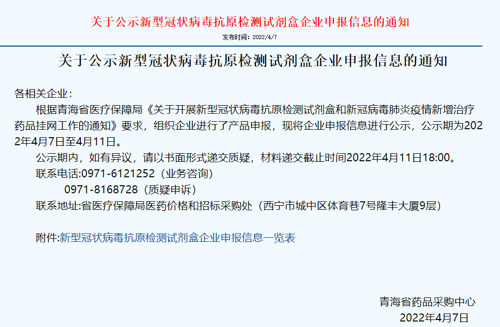 4月7日,青海省发布《关于公示新型冠状病毒抗原检测试剂盒企业申报信息的通知》,公示中标企业及试剂价格。